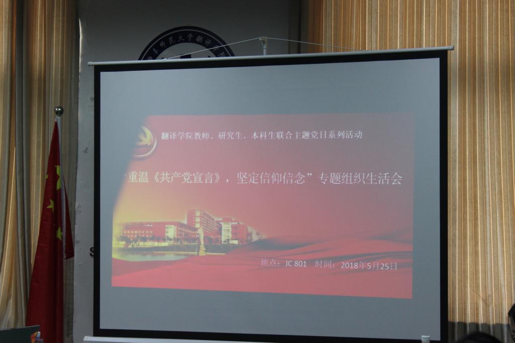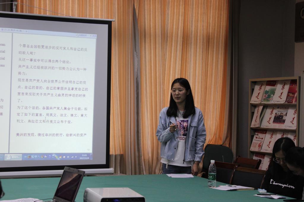 教工党支部、研究生党支部、本科生党支部于2018年5月25日14:30,在JC801集中学习研讨了《共产党宣言》,开展了“重温《共产党宣言》,再译红色经典”系列活动,并观看纪录片《不朽的马克思》。教工党支部书记周磊与本科生党支部书记孙杰琼老师共同主持此次活动。