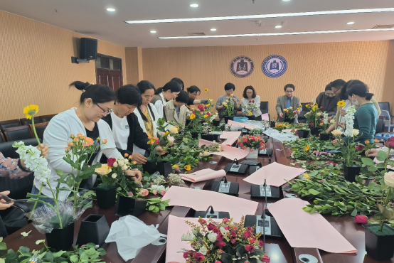 活动开始,徐凤首先说明了本次活动的主题和流程,讲解了插花用具和鲜花的选用规则,播放了精选的插花视频,讲解了“中式插花意境”“色彩搭配法则”等基本知识,展示了花泥、花托等工具的使用技巧,然后让老师们根据自己的爱好选择鲜花、花泥、包装纸、花托盆等,随后进行自由插花共享。活动以花为媒,将劳动创造与艺术美育相结合,让大家在花香中感受节日氛围,体验手工创作的乐趣。