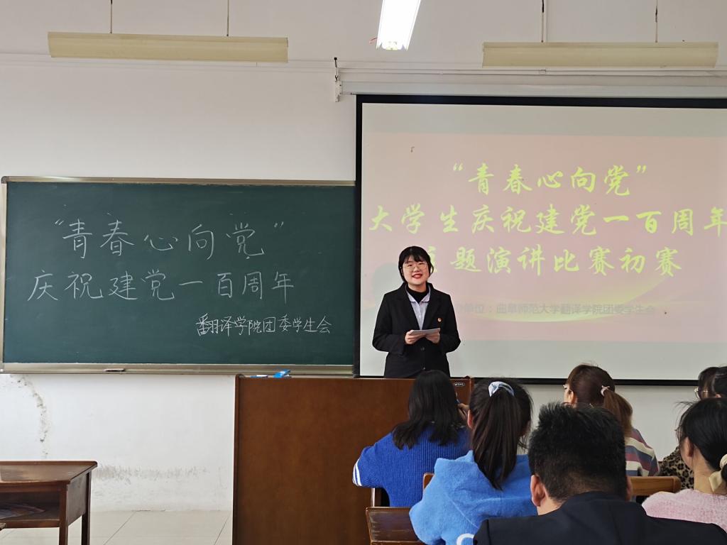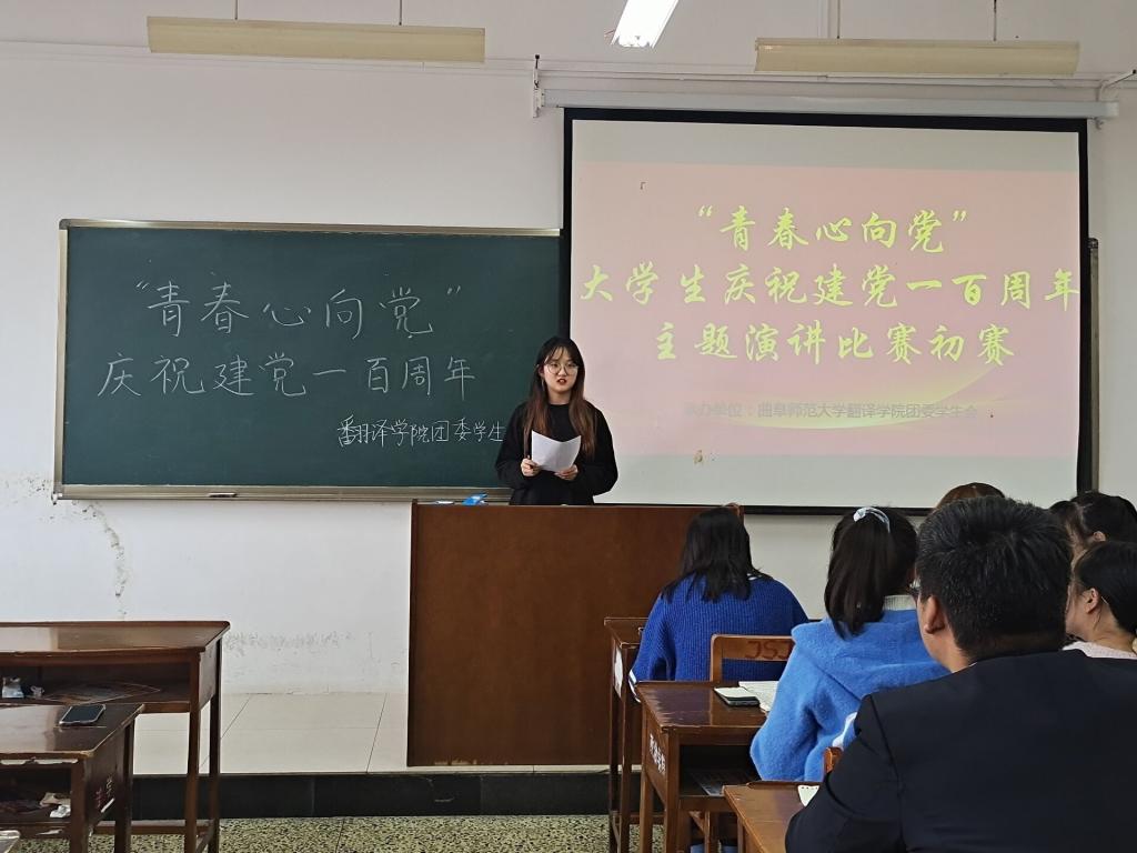比赛伊始,由主持人通过抽签的方式决定参赛选手的出场顺序。本次比赛值建党一百周年之际,以“青春心向党”为演讲主题,旨在促进当代青年大学生加强对建党历史的了解,增强以中华民族复兴为己任的责任感和使命感。比赛过程中,参赛选手们结合当代具体时事谈及中国共产党建党的光辉历史,从国际视野出发谈到当今中国所处的国际地位。其中,翻译一班杜庆甜同学讲述中国共产党成立至今的发展历程及其中涌现出的英雄事迹,抒发了对中国共产党人的由衷赞美和崇高敬意。宋文燕、鲍一鸣等同学则结合经典影视片段,用别样的风格讲述了中国共产党的发展历史。选手们声情并茂的演讲感染了每一位在场人员,赢得了观众和评委的频频掌声。经过激烈的角逐,姜睿芯、鲍一鸣、杜庆甜三位同学荣获此次初赛一等奖并晋级校级比赛,其余同学分获二等奖、三等奖和优秀奖。至此,本次演讲比赛圆满结束。