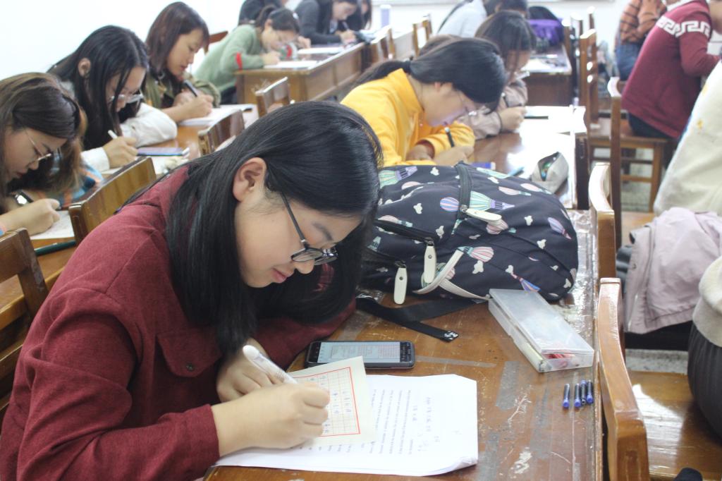 团委学生会承办的“杏坛杯”三笔字大赛于d307、d311、d315教室举行。本次比赛由党委副书记董家忠、董秀玲老师、李凯老师担任评审教师。大二、大三部分学生用参加了本次比赛。