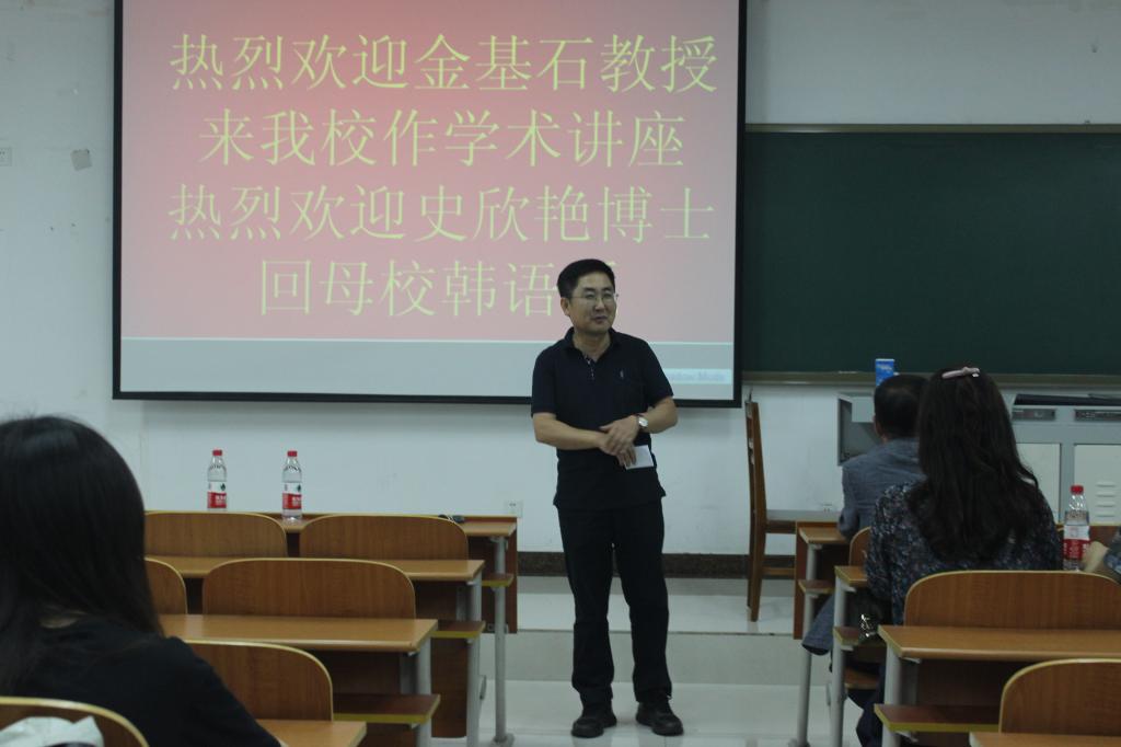 韩语系系主任金东国副教授主持。韩语系副主任周磊副教授、卢正爱副教授、范淑杰副教授,韩语系教师黄婧、白璐、章科佳、金红英以及我校13届本科毕业生史欣艳博士出席了讲座。韩语系部分研究生、本科生参加了此次讲座。