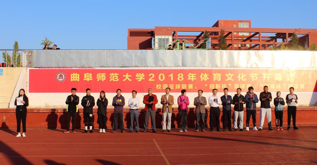 10月10日16:00,曲阜师范大学2018年体育文化节暨校园足球联赛、“迎新杯”篮球赛、“迎新杯”排球赛开幕式于西操场举行。体育教学部副主任杨弢教授,学生工作处姜振栋副教授,体育教学部足球教学研究室主任刘刚老师、篮球教学研究室王哲老师、排球教学研究室桑勇老师以及部分篮球直播吧