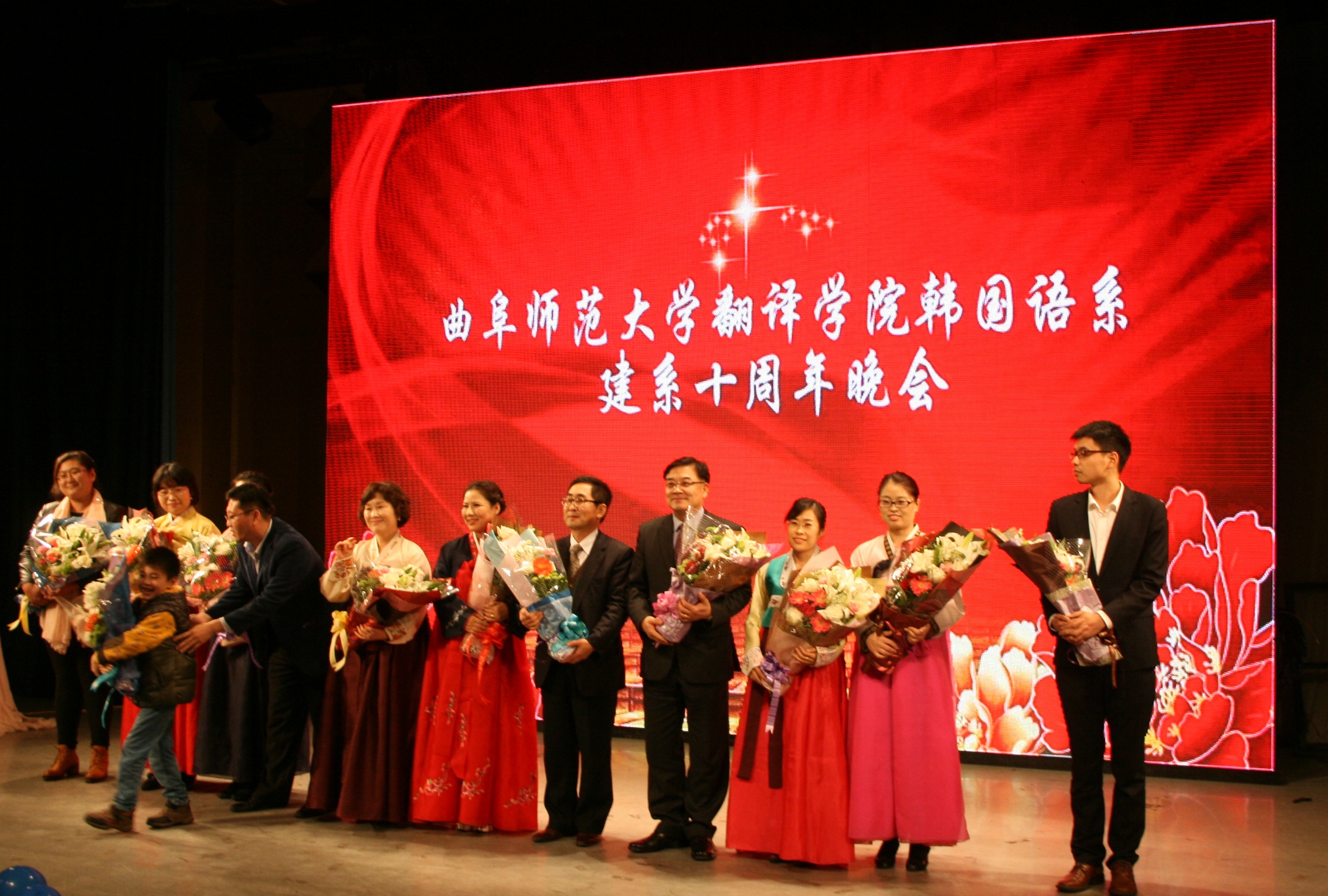 晚会开始前,一段简短的视频首先简单回顾了韩语系十年来的发展历程,并对师资队伍、教学科研、人才培养、实践教学等方面的情况作了介绍。视频中高校领导、毕业生、在校生也都纷纷表达了对韩语系的祝福与期冀。随后对有突出贡献的老师进行了表彰。一曲动人的演唱后,晚会表演正式拉开帷幕。