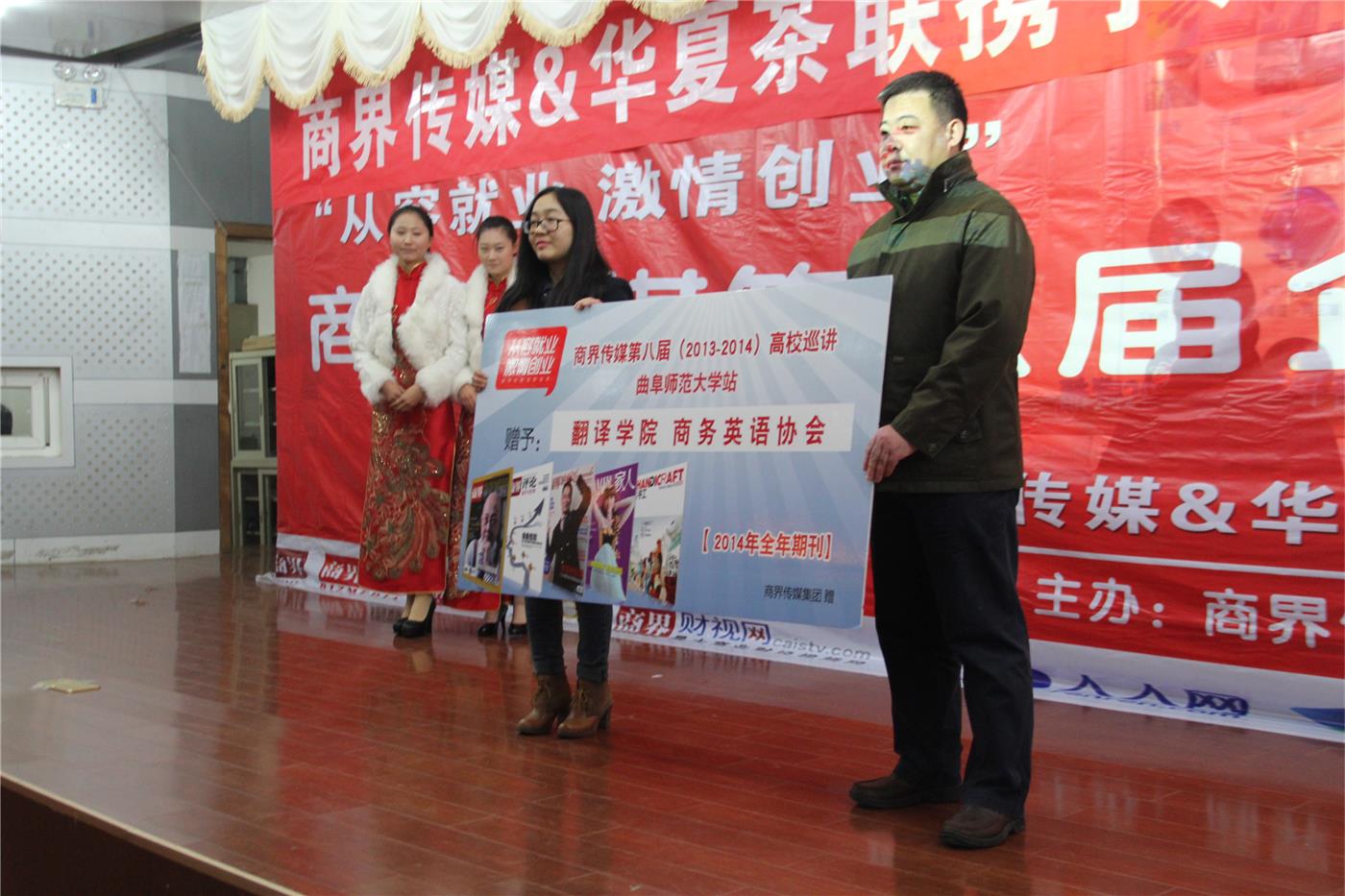 孔令军代表学校对此次活动在我校举办表示欢迎,并祝愿活动取得圆满成功。商界传媒山东运营中心行政总监卞阳女士向李金雷赠阅了全年商界杂志。杨东为林柄生和马玉峰颁发了“曲阜师范大学创业就业导师”聘书。