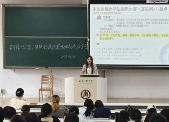 王滋润紧扣文科专业背景,结合自身实战经验,为与会同学精准导航。她明确指出,翻译学子应重点聚焦“创意组”与“红色筑梦之旅”赛道,充分发挥语言专长,在国际传播、跨境电商及非遗文创等新文科融合领域深挖潜力、寻求突破。针对备赛关键环节,王滋润着重谈到三点核心策略:一是跨学科组队,汇聚多元视角与技能;二是精雕细琢计划书,务必凸显项目创新价值与扎实的落地可行性;三是优化答辩呈现,善用图表、视频等可视化手段清晰传递核心优势。她特别提醒同学们关注赛事节奏,抢占宝贵先机。