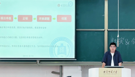 在大学生创新创业训练计划项目经验分享会上,我院省级立项项目负责人2022级翻译二班朱韵升,结合自身经验详细讲解了选题策略、申报流程及评审要点。朱韵升从团队协作、资源整合路径等方面分享了自己的实战经验,为大家提供了切实可行的实践方案,帮助同学们快速掌握创新创业项目的核心要点与实操技巧。