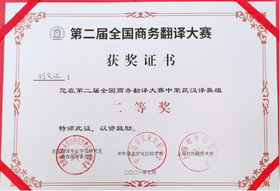承办。大赛分为“英译汉”与“汉译英”两个组别,各设特等奖1名、设立一等奖3人、二等奖6人、三等奖10人及优胜奖等类别。本次大赛分为初赛和决赛两个环节,内容涵盖了贸易合同、股票投资、电子商务等商务翻译领域的主要内容。刘文江同学经过初赛线上翻译的选拔,成功晋级决赛,并在决赛中沉着应对、冷静答题,凭借扎实的语言功底获得了全国二等奖的良好成绩。
