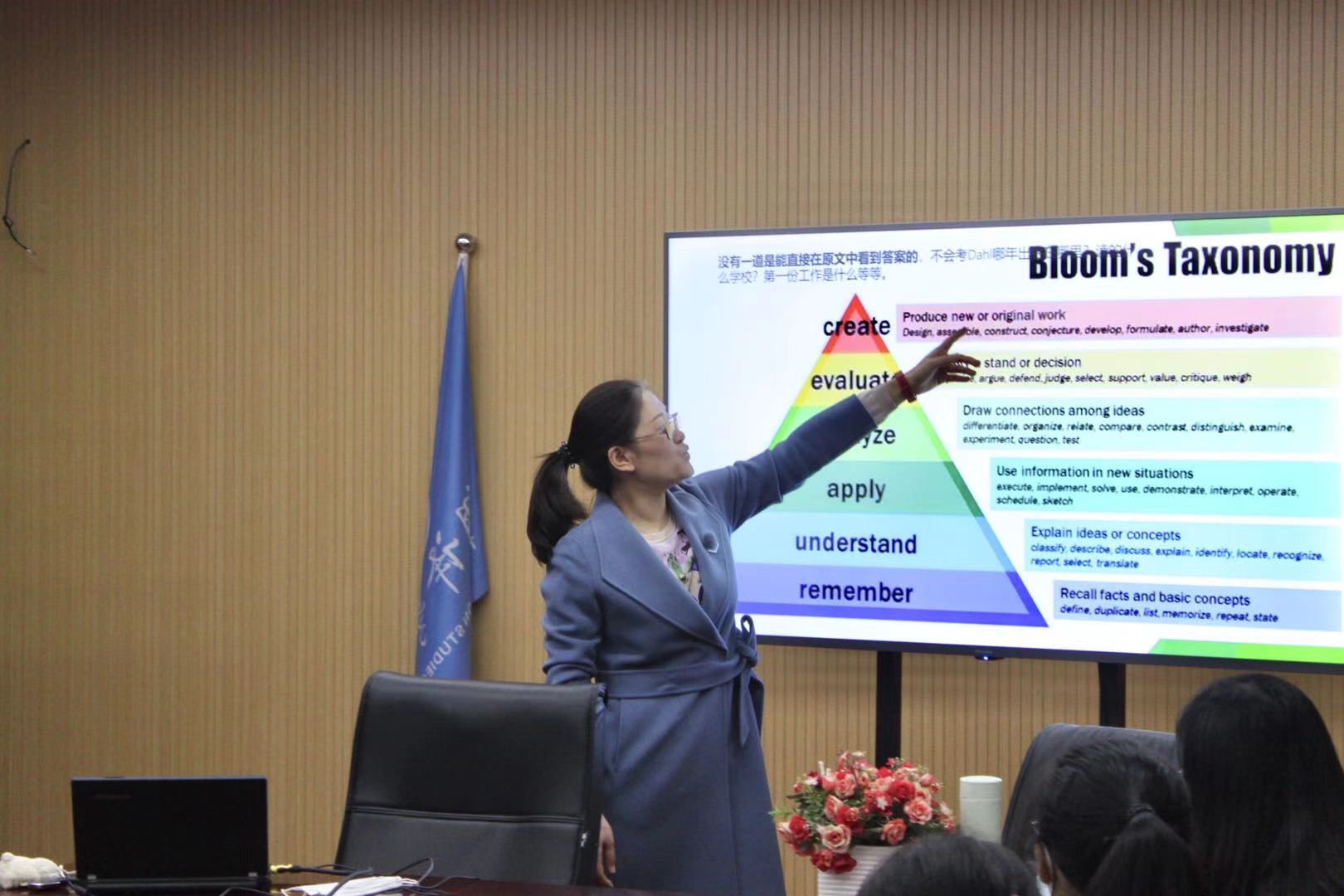 讲座伊始,刘瑶老师用图表比较了国内外人均读书量的差异,并询问了同学们的读书情况。她强调,在阅读过程中,不仅需要了解文章的大体内容,更需要精读文章,了解文章深层次的意义。接着,她指出在美国小学的课程中,阅读所占的比重较大并和写作相结合,在课堂中老师会要求同学们按照“cold read ,warm read ,and hot read”的模式阅读三遍文章,并且在阅读过程中要积极思考。老师课堂上给学生讲解阅读技巧,介绍阅读方法,并引入了很多图表工具等来帮助学生理解、思考、提高阅读的速度和有效性,老师们采用布卢姆的分类法,把阅读分为六个层次:记忆、理解、应用、分析、评估和创作,提倡教学应促进学生高级认知能力,培养学生创新思维并鼓励学生创作自己的作品。