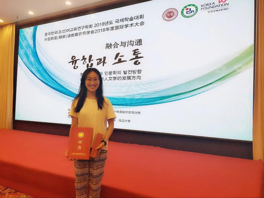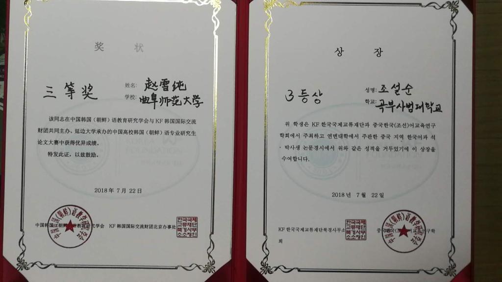 2018年7月20日至22日,中国韩国(朝鲜)语教育研究学会2018年度国际学术大会和全国高校朝鲜语专业硕博研究生论文大赛在延边大学举行。本次大会由中国韩国(朝鲜)语教育研究学会和KF韩国国际交流财团主办,共有来自中国、韩国、日本、英国等国家的200多名学者参加;北京大学、北京外经贸大学、复旦大学、上海外国语大学等全国19所高校共20余名研究生参加了这次全国高校朝鲜语专业硕博研究生论文大赛。本次朝鲜语专业硕博研究生论文为自命题形式,要求选手通过课件进行现场讲解,我院韩语系2017级学术型硕士研究生赵雪纯,在导师金东国的精心指导下,积极备赛,沉着应对,经过激烈角逐,不负众望,在本次大赛中脱颖而出,喜获三等奖的佳绩。