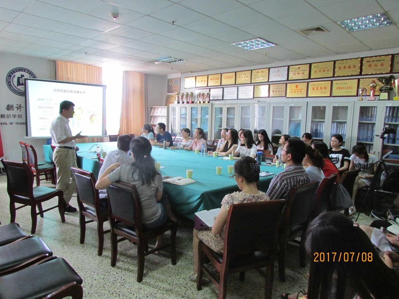 作了一场题为“ How does the brain process language information? ”的学术报告,对EEG和ERPs实验技术在语言研究中的应用进行了精彩的讲解。此次报告会由我院周统权教授主持,我院部分教师及相关专业研究生聆听了此次报告。