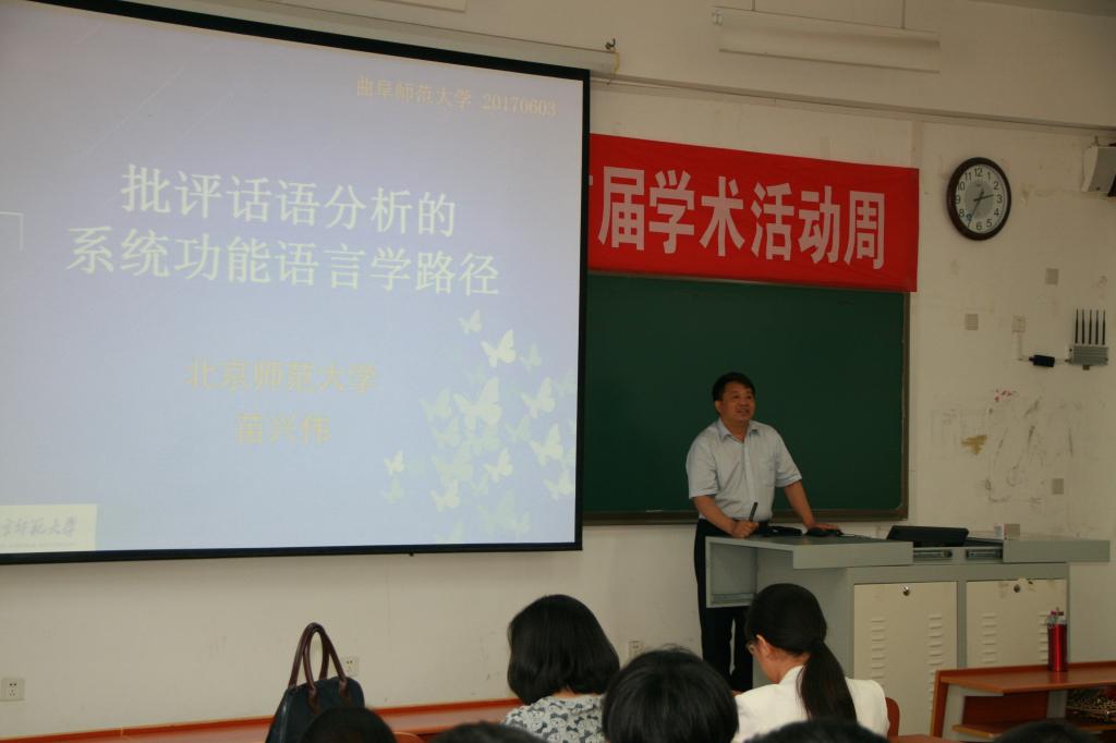 2017年6月3日下午2:30,北京师范大学苗兴伟教授在我校日照校区JS107教室为我院师生作了一场精彩的学术讲座。此次讲座由我院夏云副教授主持。讲座主题为“批评话语分析的系统功能语言学路径”。