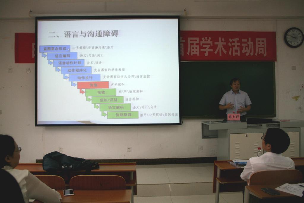 本次讲座主题为人类沟通与语言病理学。高立群教授所作报告主要有以下几点:首先,高立群教授向我们介绍了什么是人类沟通以及什么是语言病理学,然后简述了语言病理学的相关基础学科,在此基础上,周立群教授向我们介绍了语言病理学的主要研究方向。最后,高立群教授阐述了语言病理学与特殊教育的关系以及研究语言病理学的主要研究意义。