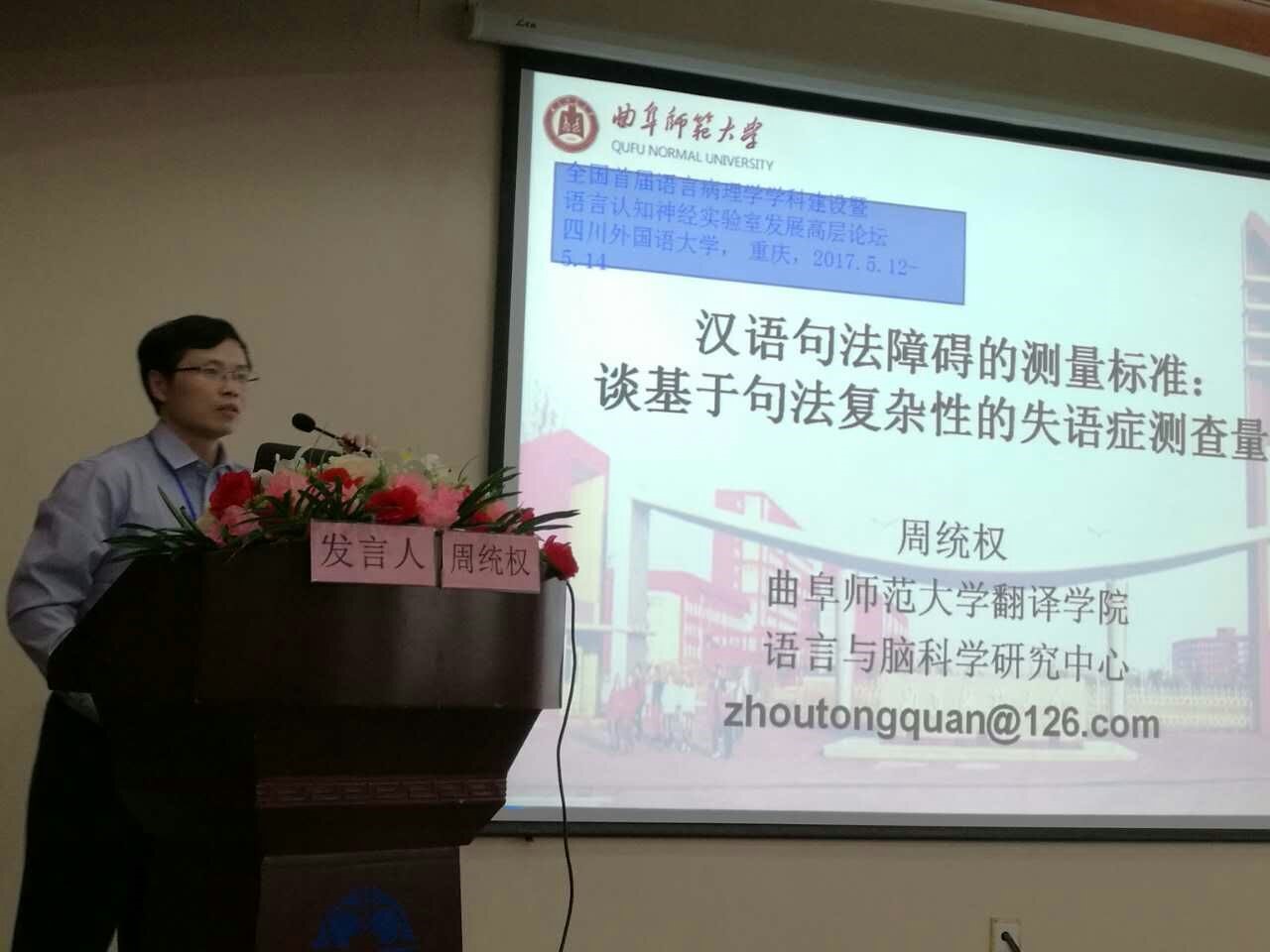 和脑科学研究中心还介绍了创办神经语言学实验室和语言康复中心的经验和遇到的困难。我院语言与脑科学研究中心的周统权教授应邀出席了会议,并作了题为“汉语句法障碍的测量标准:谈基于句法复杂性的失语症测查量表”的大会发言,引起与会者的广泛关注和极大兴趣。