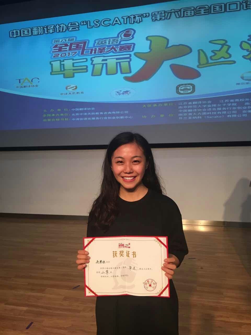 大赛分设英译中与中译英两个环节,要求选手听到原文音频后,借助笔记进行即时口译。面对激烈竞争,我院两名学子勇于争先,指导老师及时跟进,最终取得了优异的成绩。王晓彤、赵梦依两名选手均获华东赛区三等奖,带队老师顾晓燕荣获优秀指导教师奖。