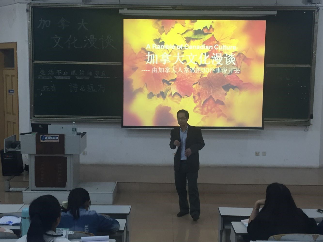 杨老师的讲座揭开了加拿大这个遥远国度的面纱,把英语国家文化的共性与加拿大文化的个性作了十分贴切的概括和生动的演绎。本次讲座不仅开阔了同学们的眼界,提高了同学们对加拿大文化的认识,也为有意出国留学的同学提供了文化指导。