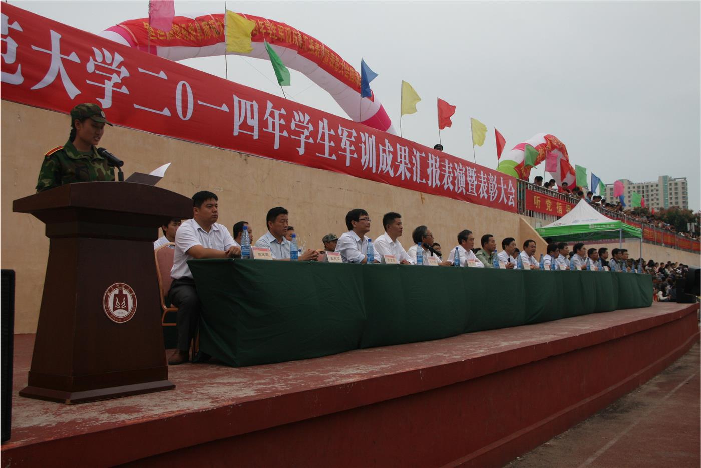 2014年9月23日下午,曲阜师范大学2014年学生军训成果汇报表演暨表彰大会在我校西操场隆重举行。出席大会并在主席台就座的各位领导有党委书记荆兆勋,日照市委副秘书长、大学科技园工委书记、管委主任王均波,山东陆军预备役炮兵师第一副团长、军训团团长李建勋,党委副书记、曲阜师范大学2014年军训领导小组组长孙文亮,副校长、日照校区管委会主任马东骅,纪委书记、日照校区管委会副主任郭辰夫,副校长、日照校区管委会副主任杨冰,日照校区管委会主任助理、管理办公室主任池福安,日照校区图书馆馆长刘显平。在主席台就坐的还有各职能部门有关负责同志、各篮球直播吧