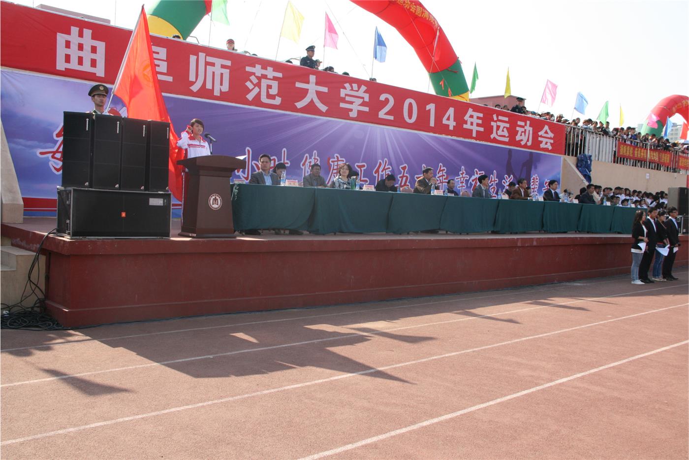 5月8日上午8:00,曲阜师范大学日照校区2014年校运动会开幕式在西操场拉开帷幕,曲阜师范大学党委书记荆兆勋,副校长、日照校区管理委员会主任马东骅,纪委书记、日照校区管理委员会副主任郭辰夫,日照校区管理委员会助理兼管理办公室主任池福安,篮球直播吧