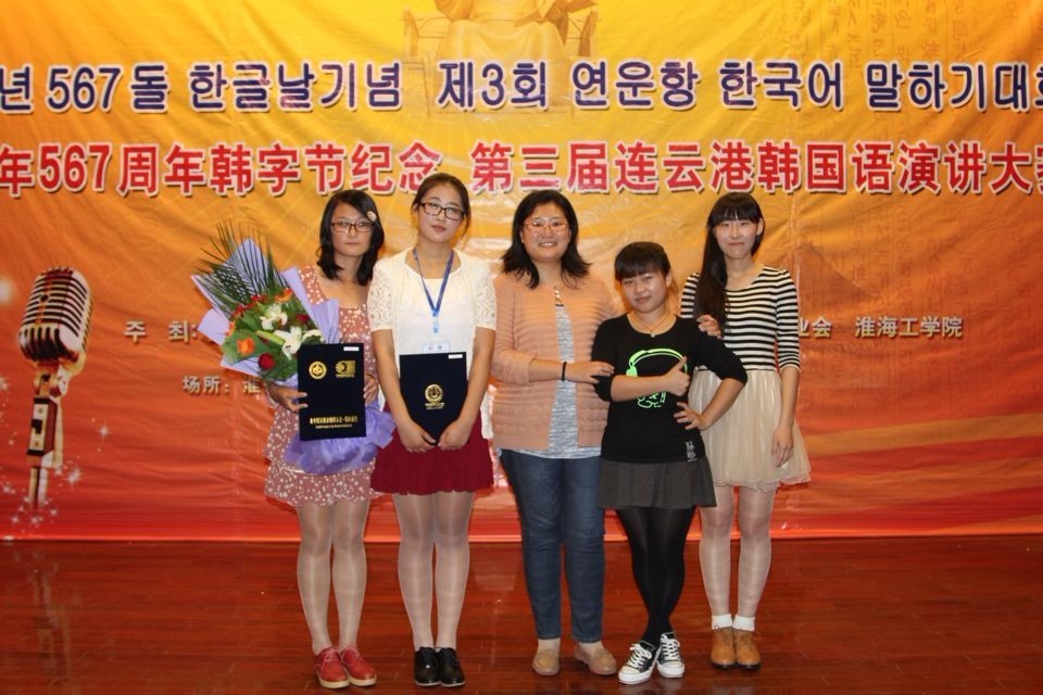 以及连云港财经高等职业技术学校等高校的18名选手。我校韩国语系由黄婧老师指带队下11级、12级的4名同学参加了比赛。比赛定题演讲和现场问答两部分组成。经过激烈角逐,我校韩国语系的冯珂同学和赵凯悦同学在比赛中脱颖而出,分获“韩国清州大学总长奖”和“日照韩人商会会长奖”。其中冯珂同学获得到韩国清州大学留学半年(全额奖学金)的学习机会。
