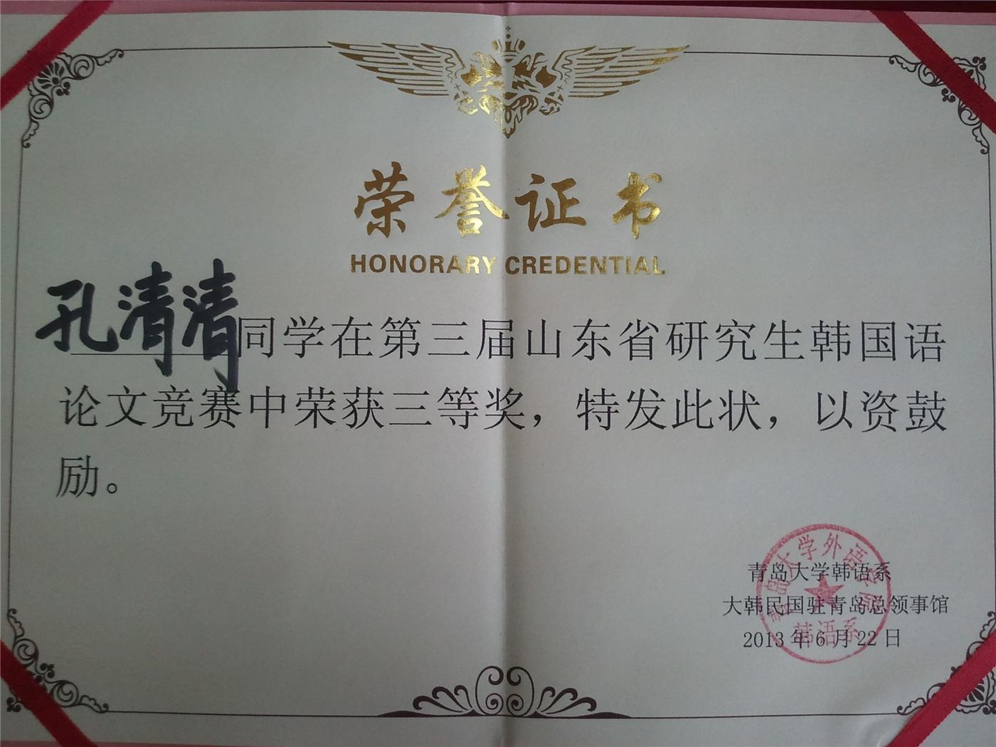 我校今年首次参加省级研究生韩语论文竞赛。本次大会取得的良好成绩证明韩国语系自建系以来已经取得了长足的发展与进步,也是对我院研究生培养质量的检验与肯定。希望韩国语系今后再接再厉,蓬勃发展,再创辉煌。