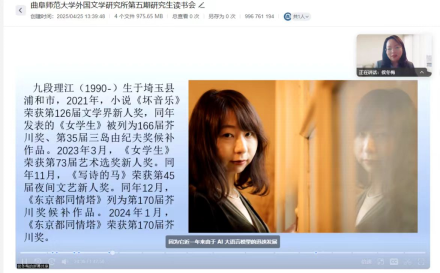2025年4月25日,曲阜师范大学外国文学研究所第五期研究生读书分享会在JC801会议室及腾讯会议平台同步举行。本期读书会分享人为外国文学研究所所长侯冬梅副教授,分享的图书是日本作家九段理江荣获2024年度第170届芥川奖的获奖作品《东京都同情塔》。日语系师生以及兄弟院系的本科生同学参加了此次读书分享。