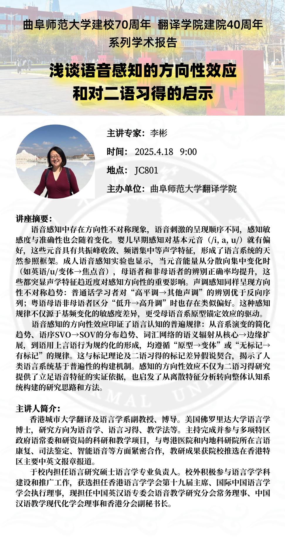 李彬教授专家讲座:浅谈语音感知的方向性效应和对二语习得的启示
