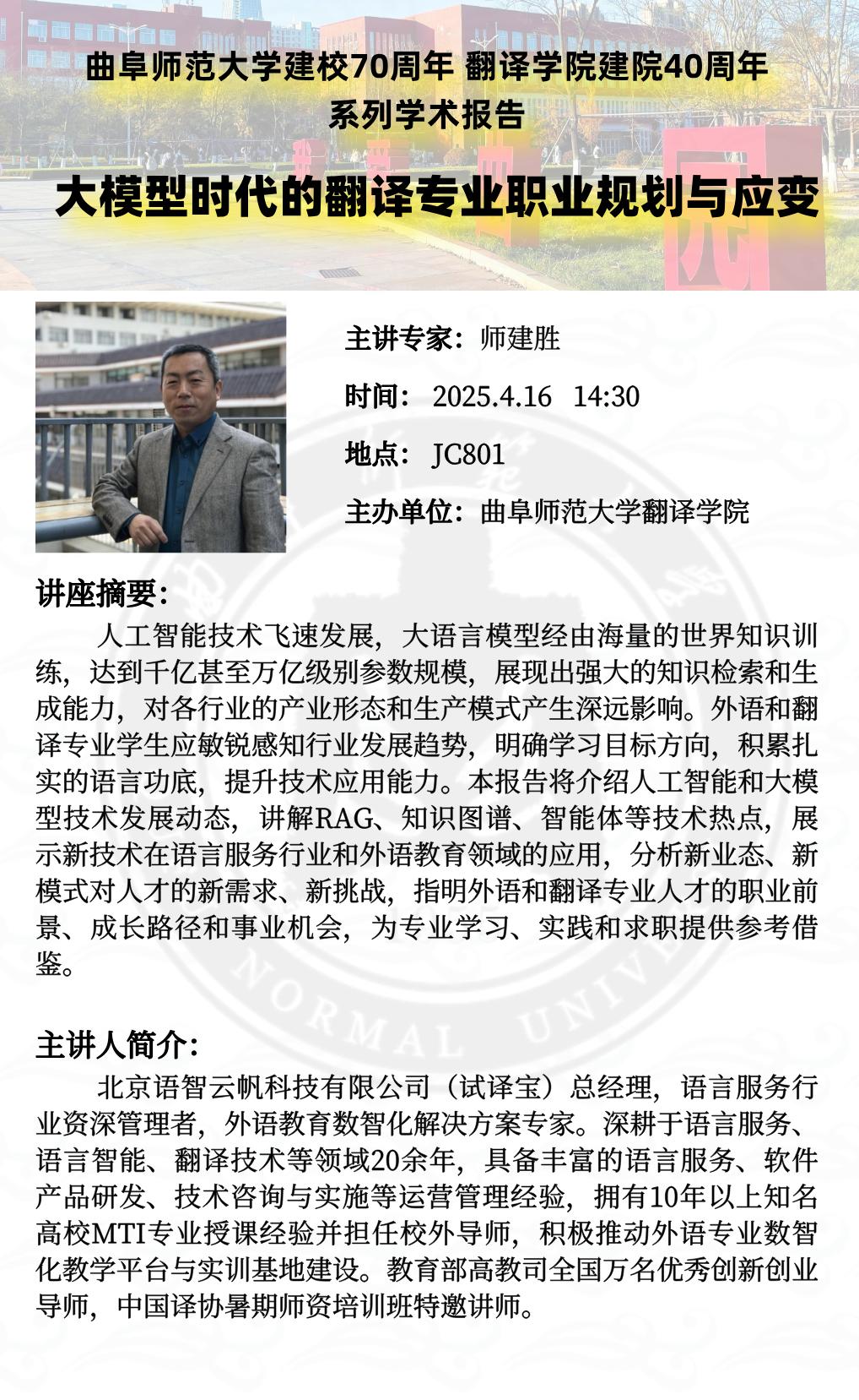 师建胜教授专家讲座:大模型时代的翻译专业职业规划与应变